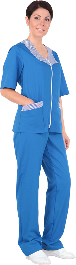 Удобный костюм для женщин, сшитый из мягкой и прочной ткани. Изделие выполняет функции униформы для работниц сферы услуг. Блузон имеет V-образную горловину, обрамлённую декоративной вставкой в полоску. Застёжка выполнена по центру в виде молнии из полимерного материала белого цвета. Врезные карманы расположены между передним и боковым швами и оформлены полоской из материала-компаньона. Брюки прямые, имеют эластичный пояс.